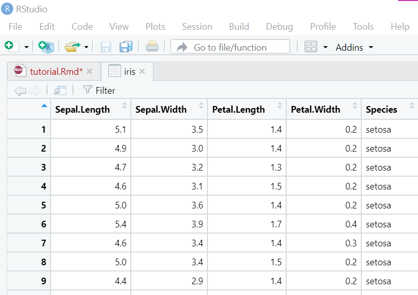 You can’t make graphs without datasets! In R, there are multiple ways to import datasets depending on your dataset types. Click here to learn more about how to import datasets in R! In this tutorial, we will be using one of the built-in datasets in base R called iris.